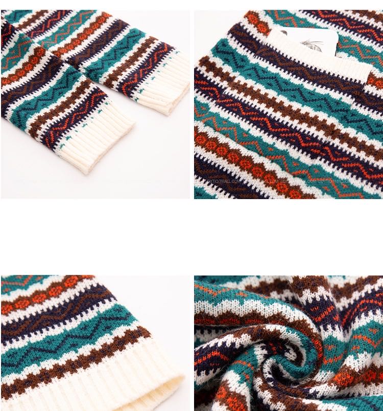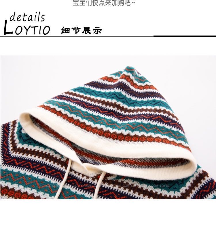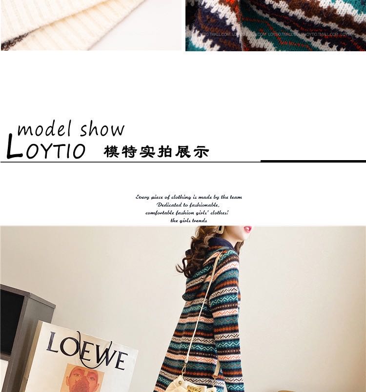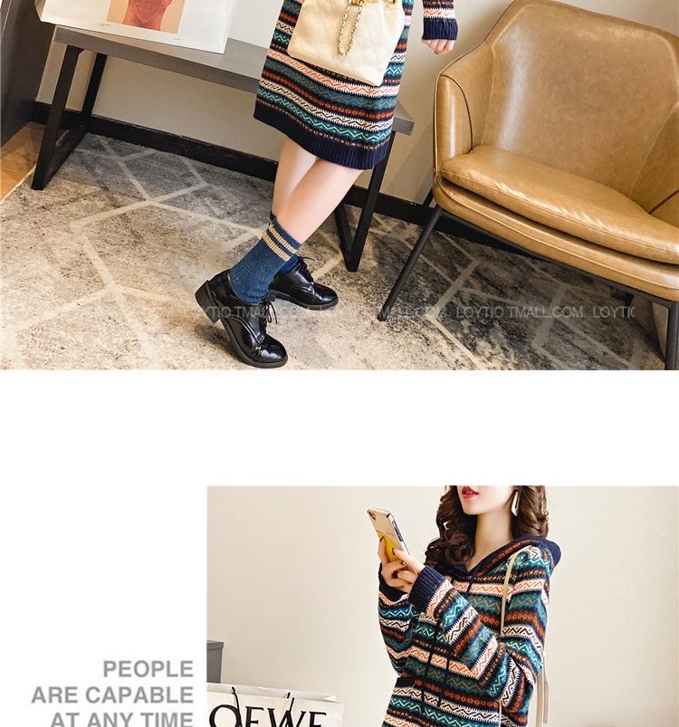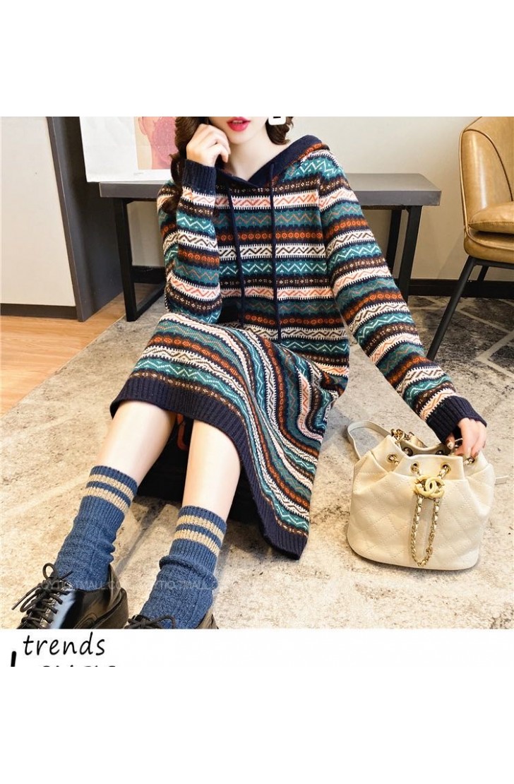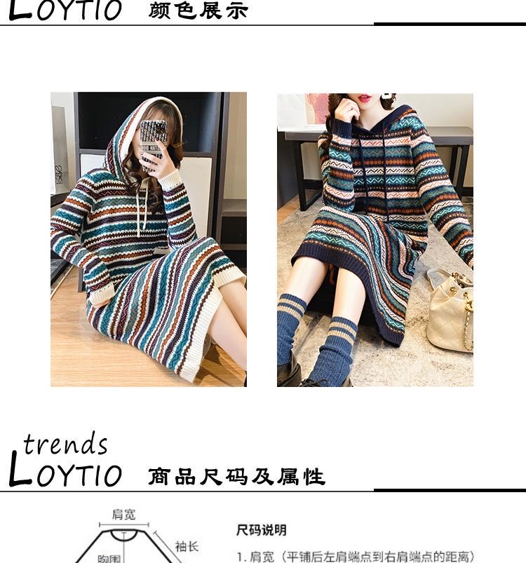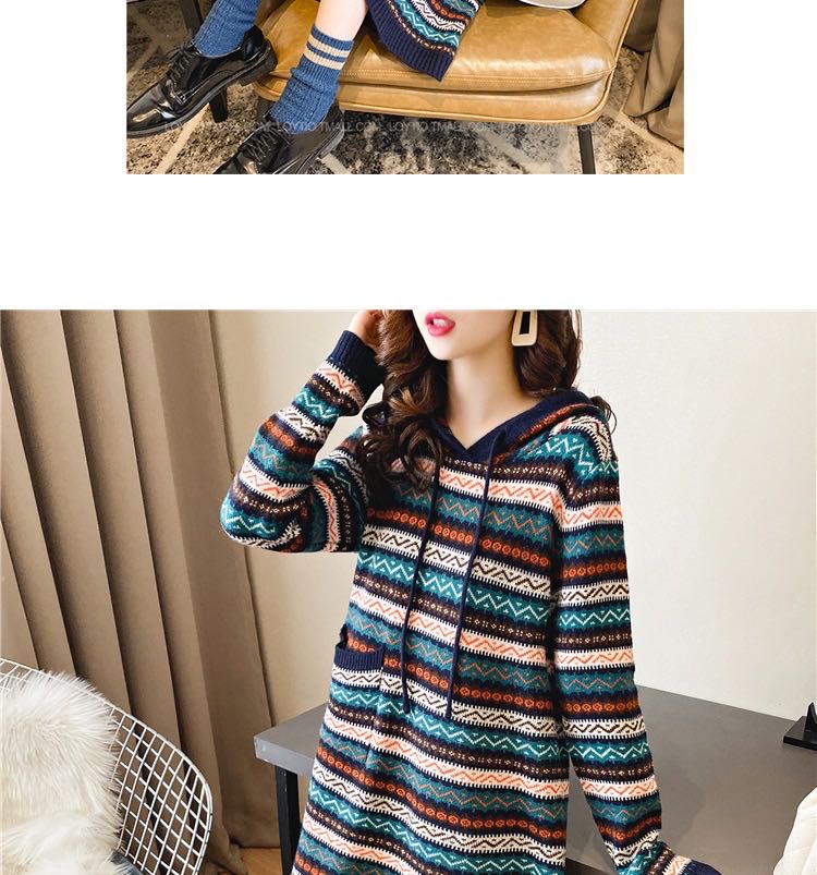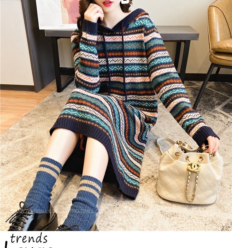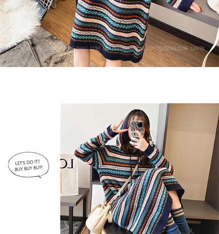 titivate中长款复古民族风条纹过膝毛衣裙女网红宽松长袖连帽套头毛衣外套