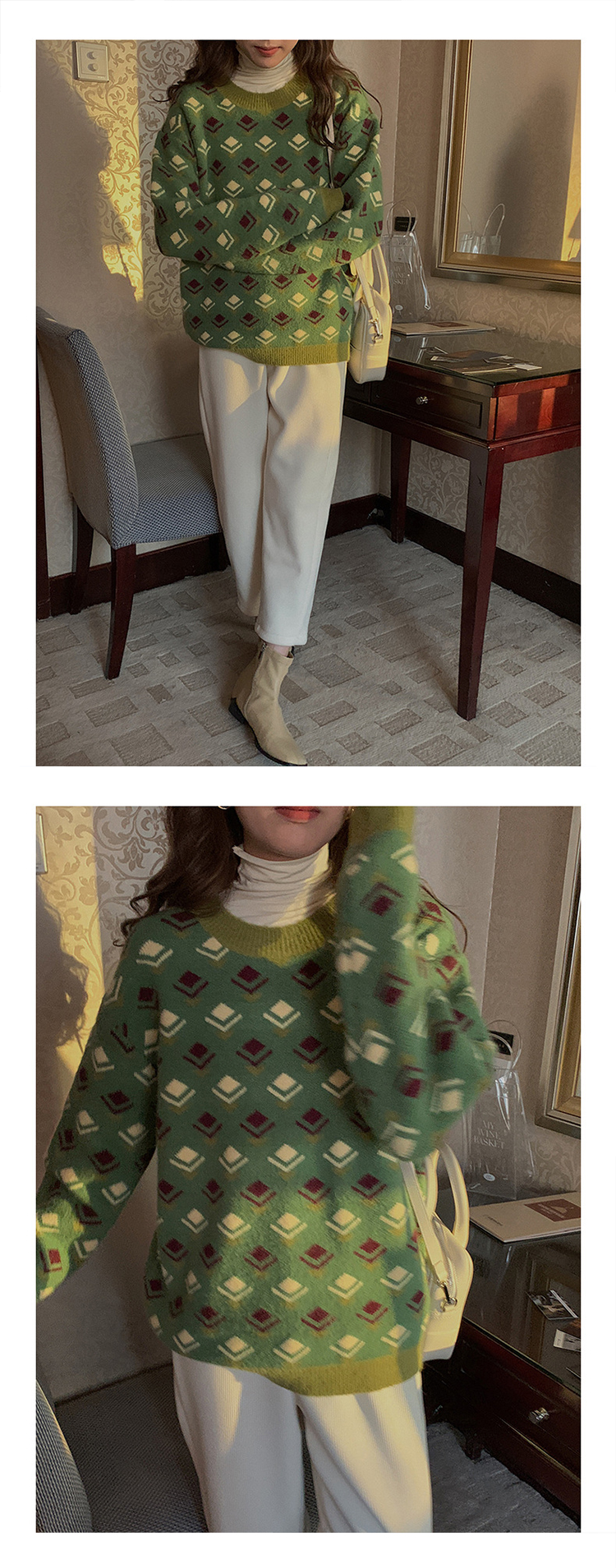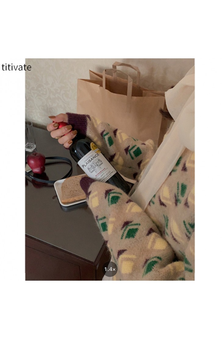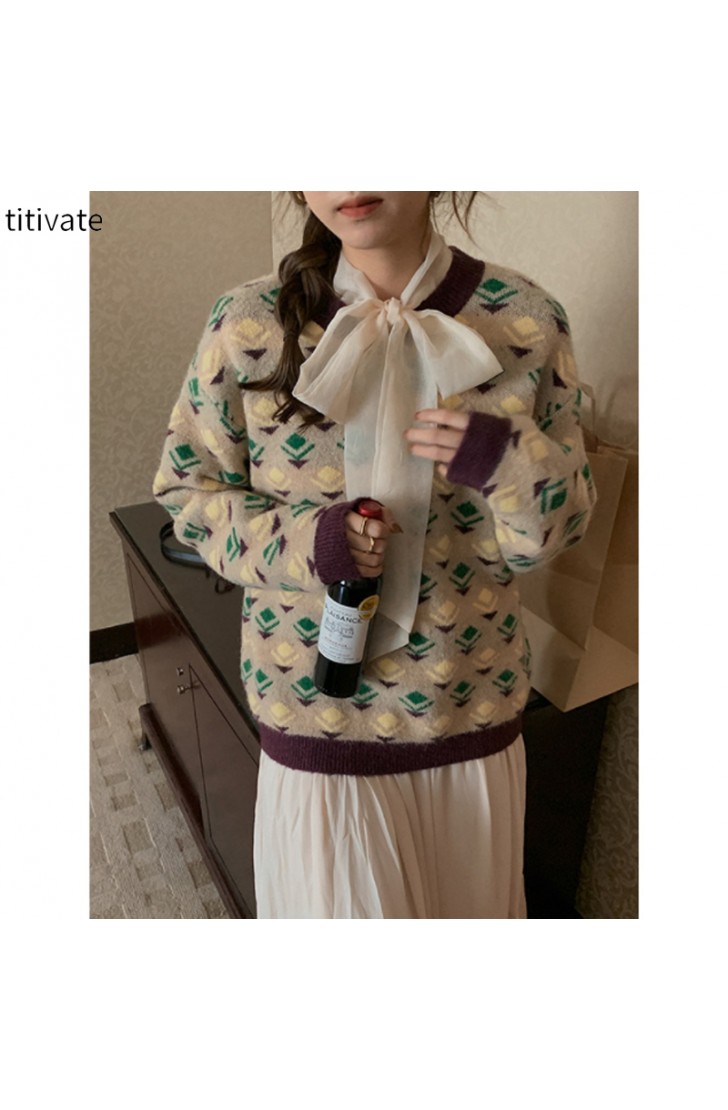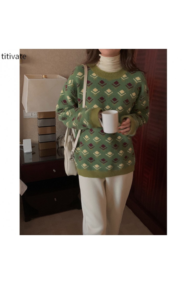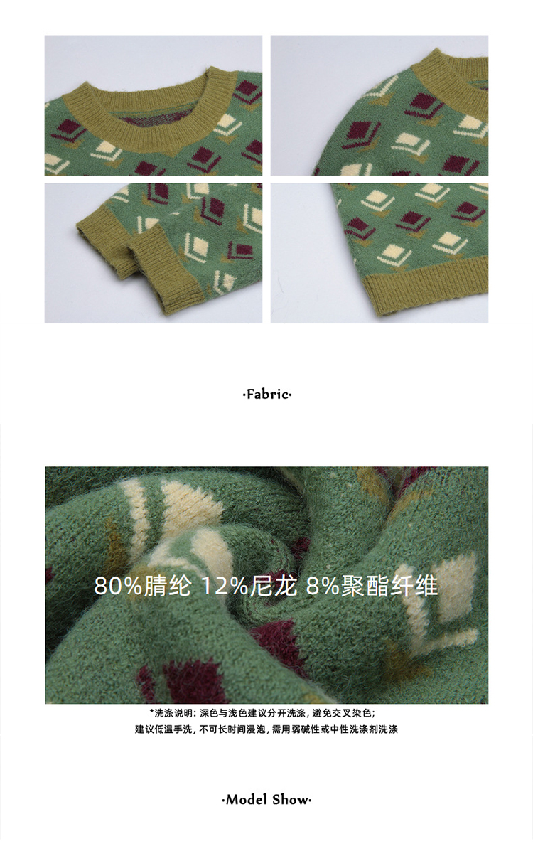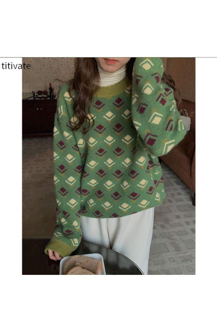 titivate绿色圆领印花毛衣小众设计感女装冬季新款宽松上衣