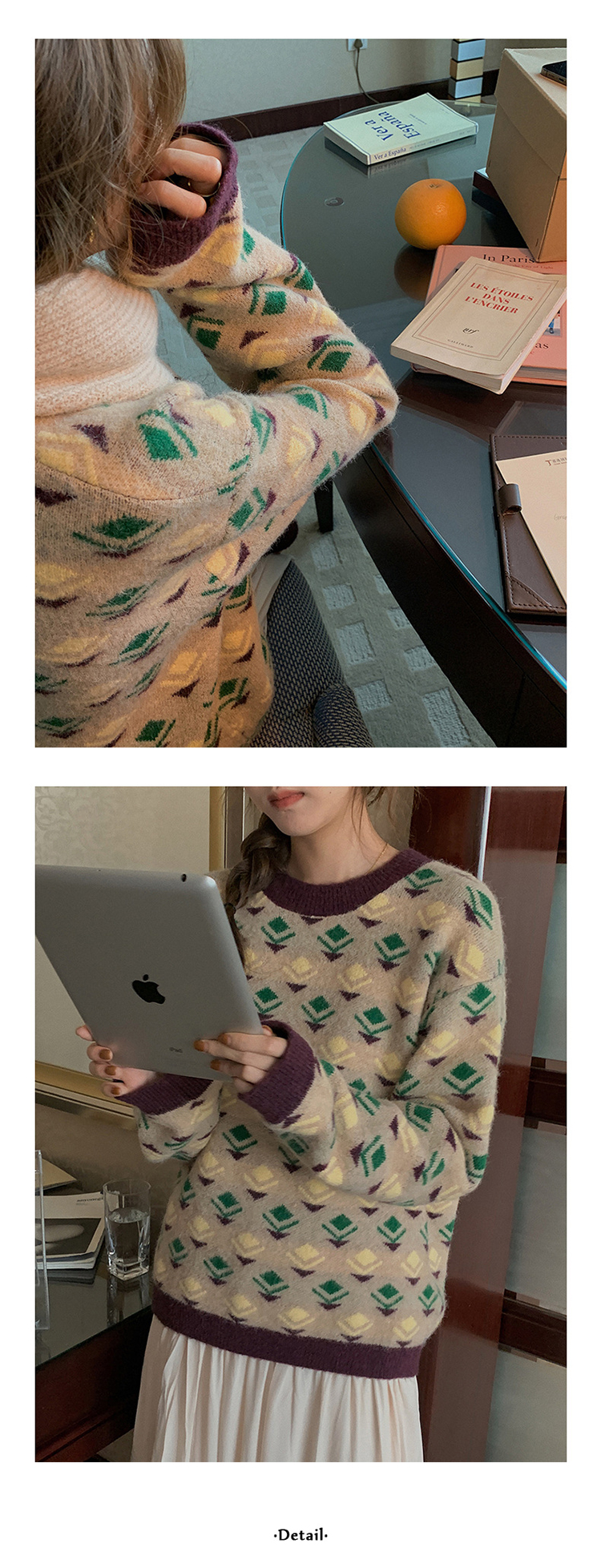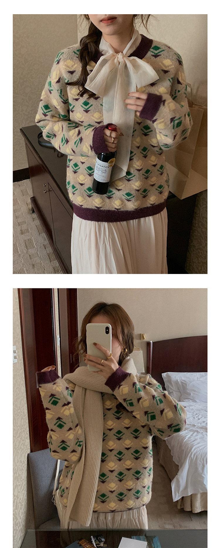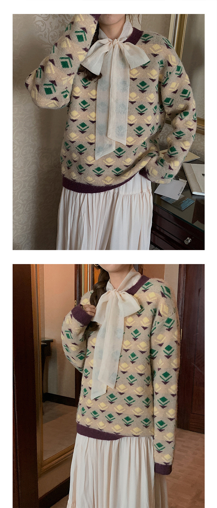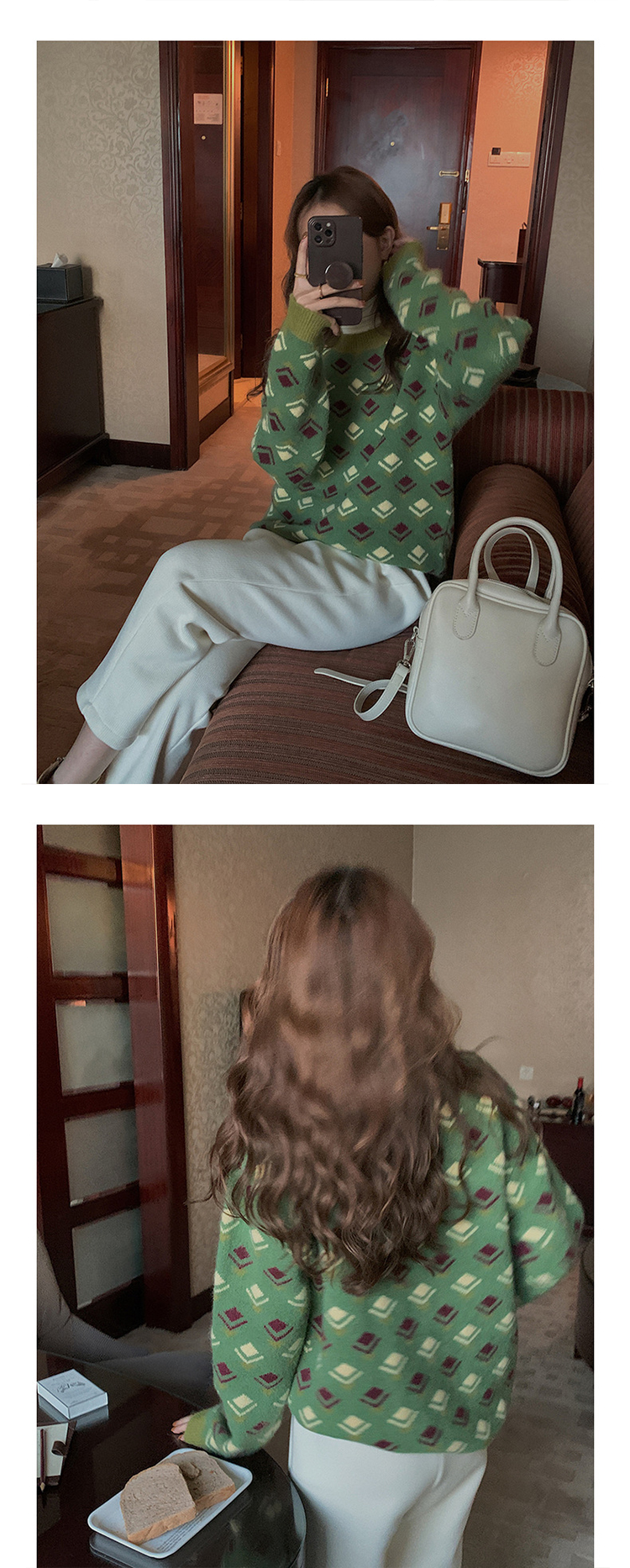 titivate绿色圆领印花毛衣小众设计感女装冬季新款宽松上衣