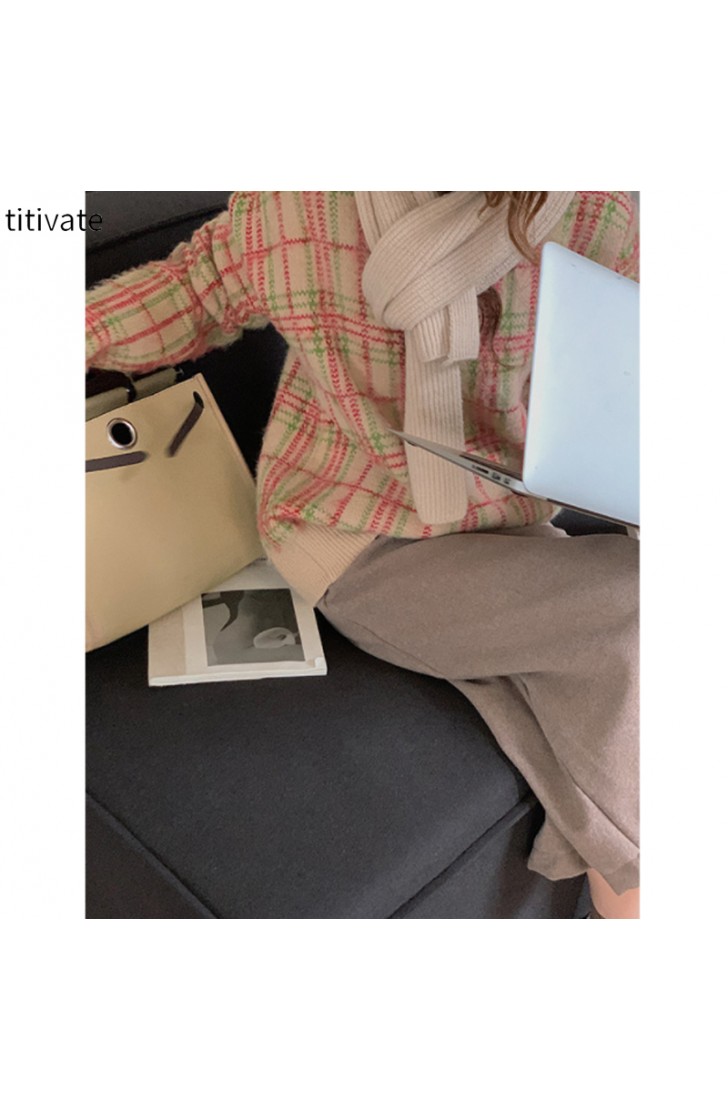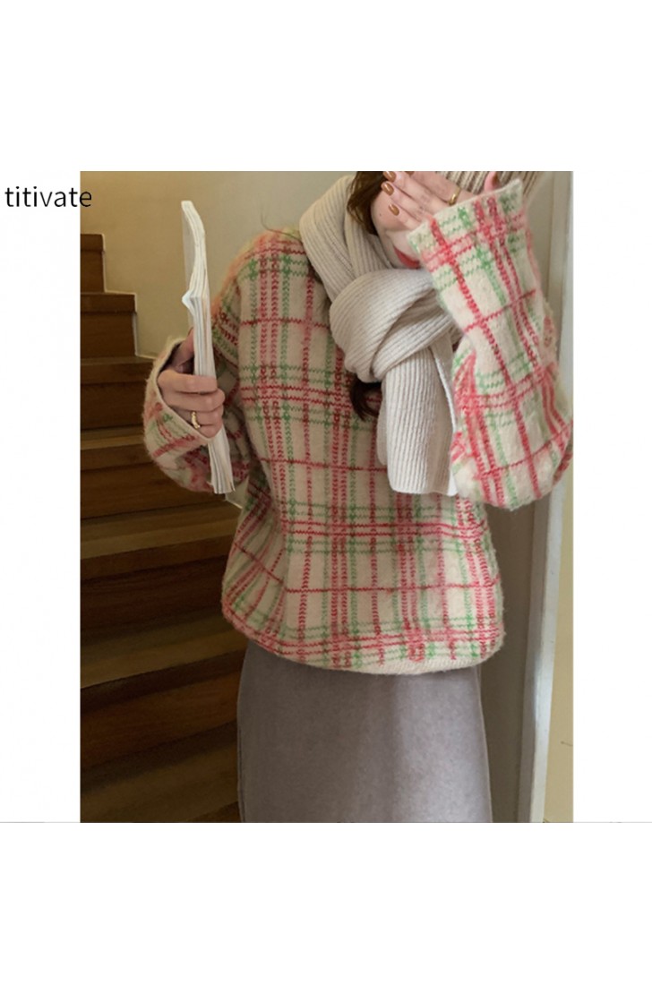 复古格子兔绒毛衣女装冬季新款慵懒风宽松上衣外套