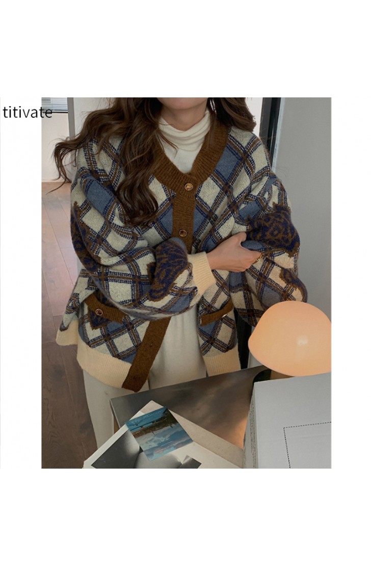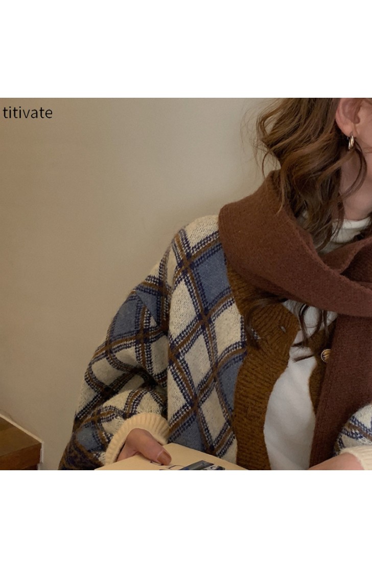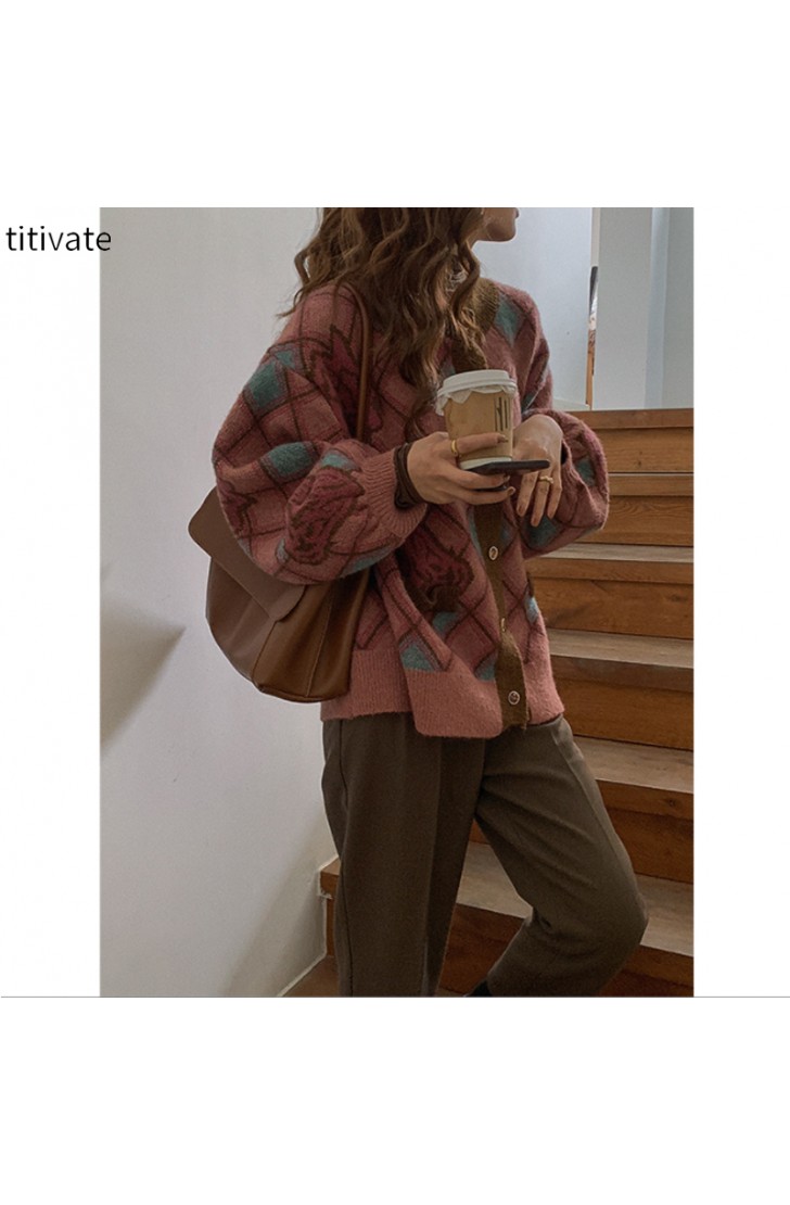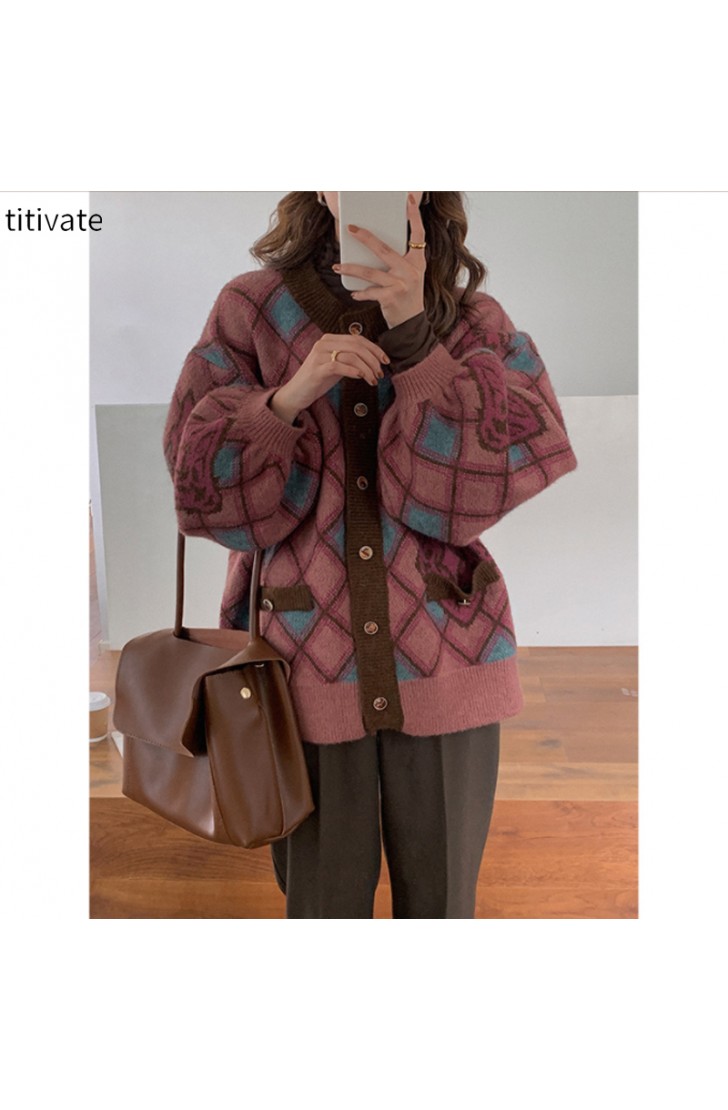 titivate复古菱格毛衣女秋冬季新款韩版宽松慵懒风针织开衫
