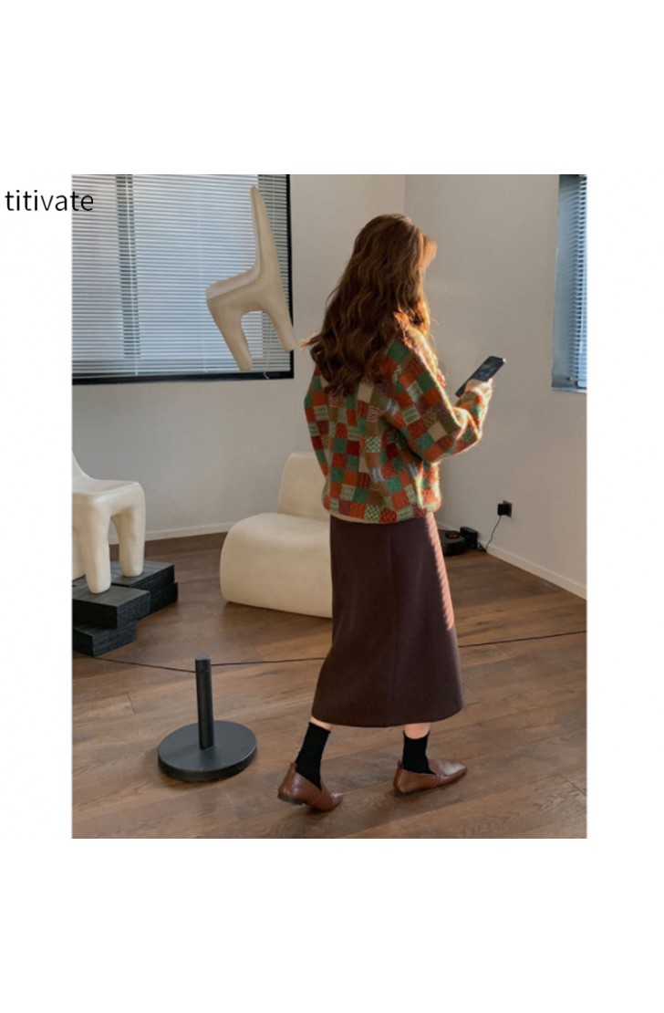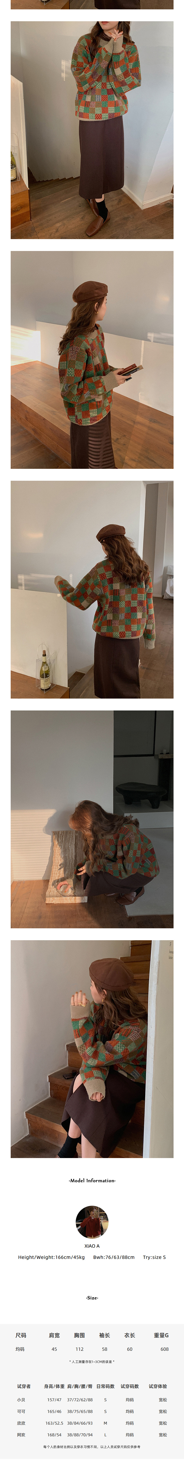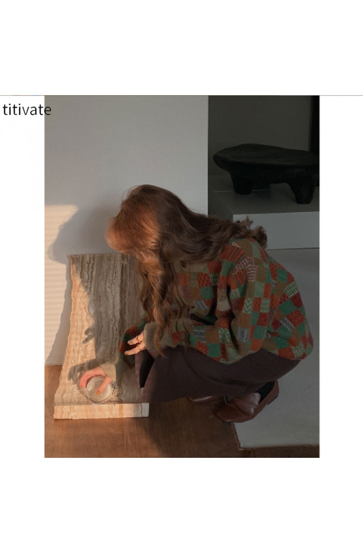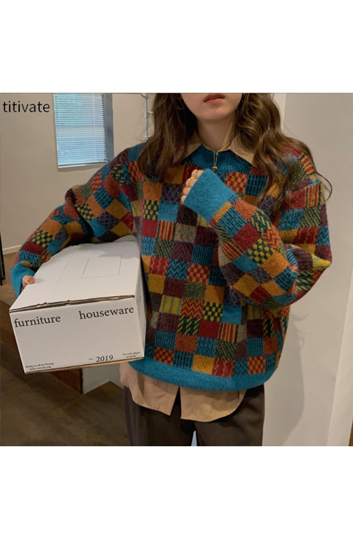 titivate秋冬季新款毛衣女格子复古圆领宽松外穿针织衫上衣