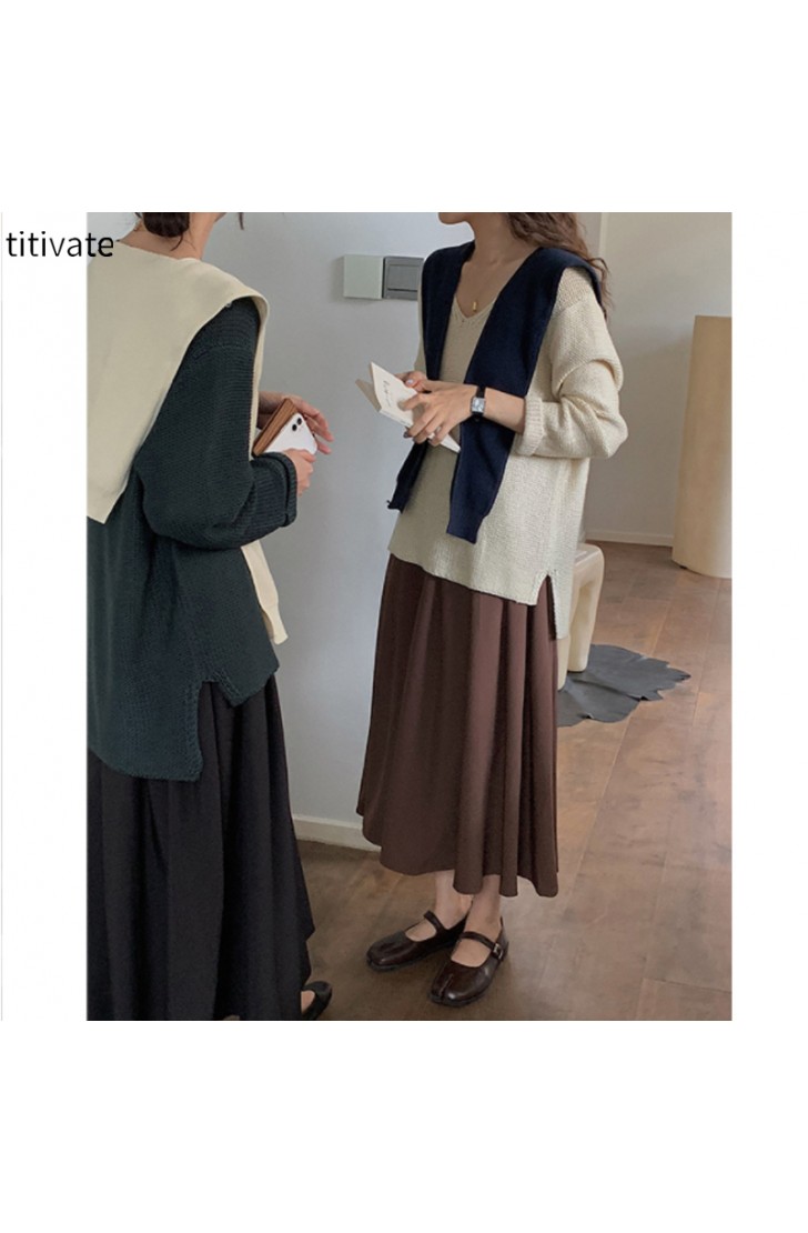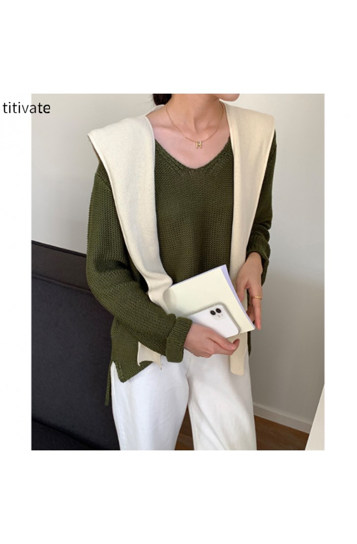 titivate针织罩衫女外穿V领宽松长袖上衣春秋季新款镂空毛衣