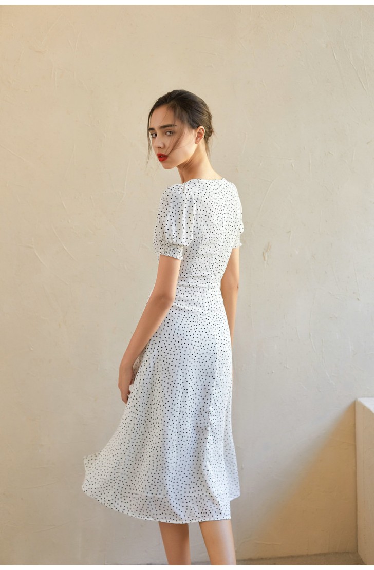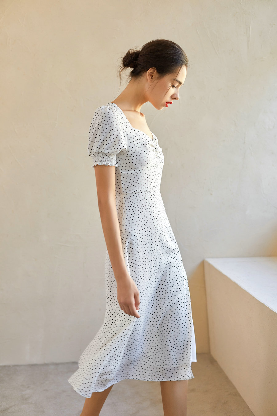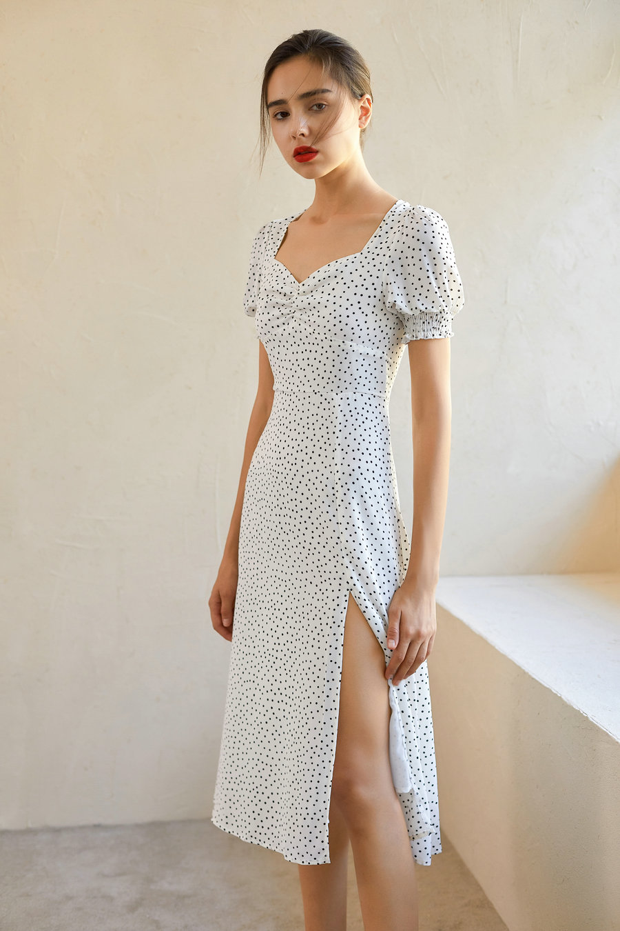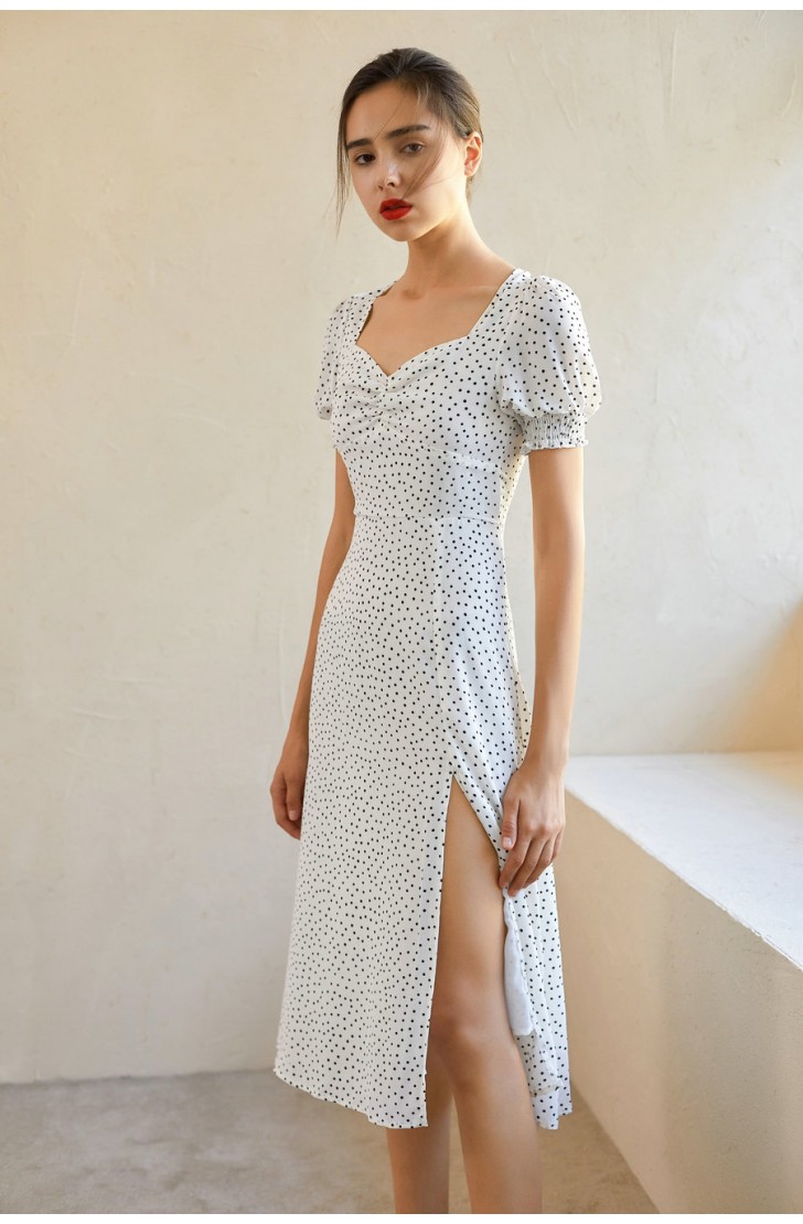 titivate品牌女装2020春夏新款白色波点收腰显瘦开衩连衣裙中长款