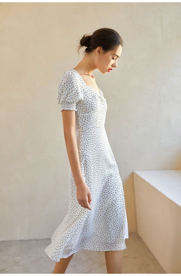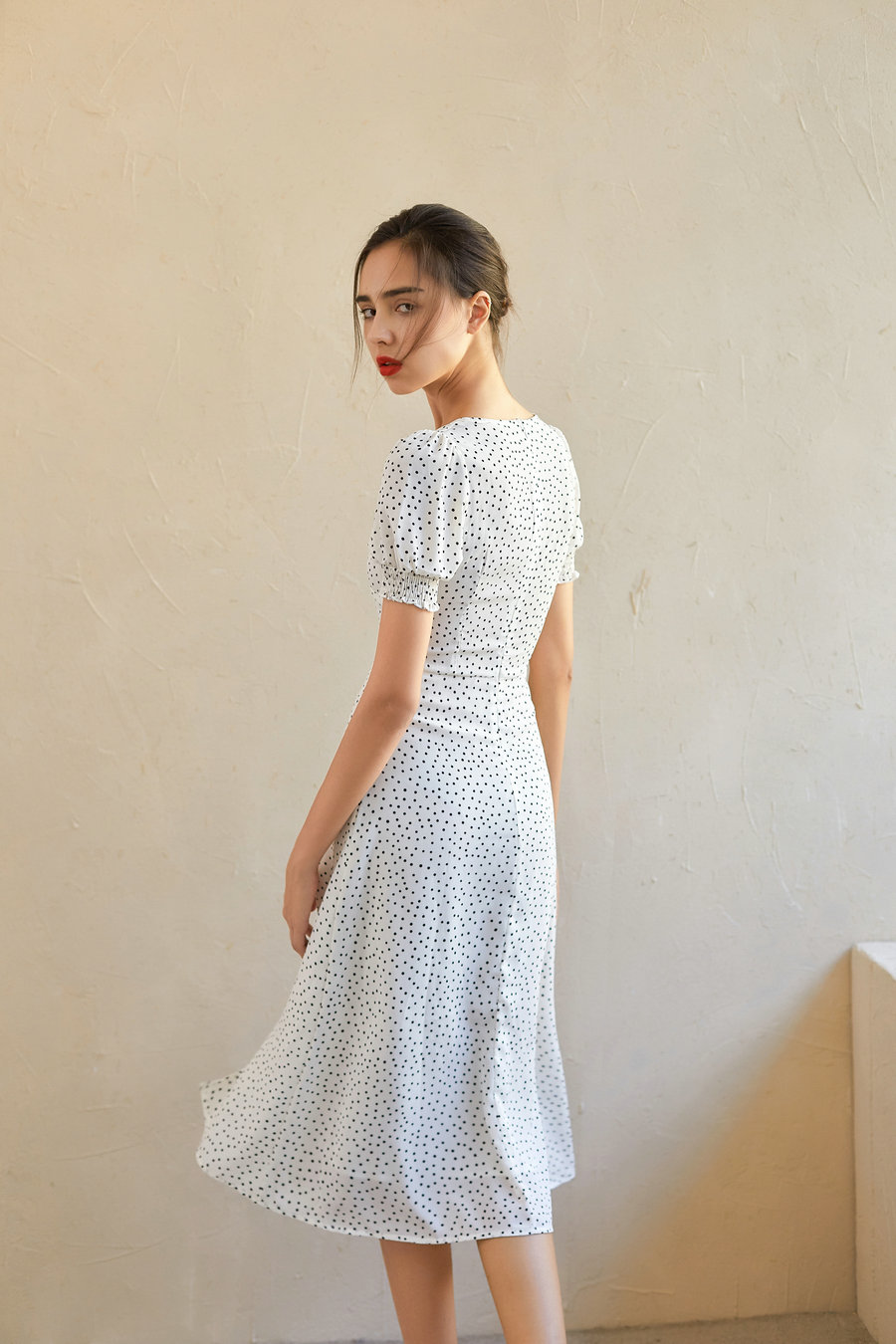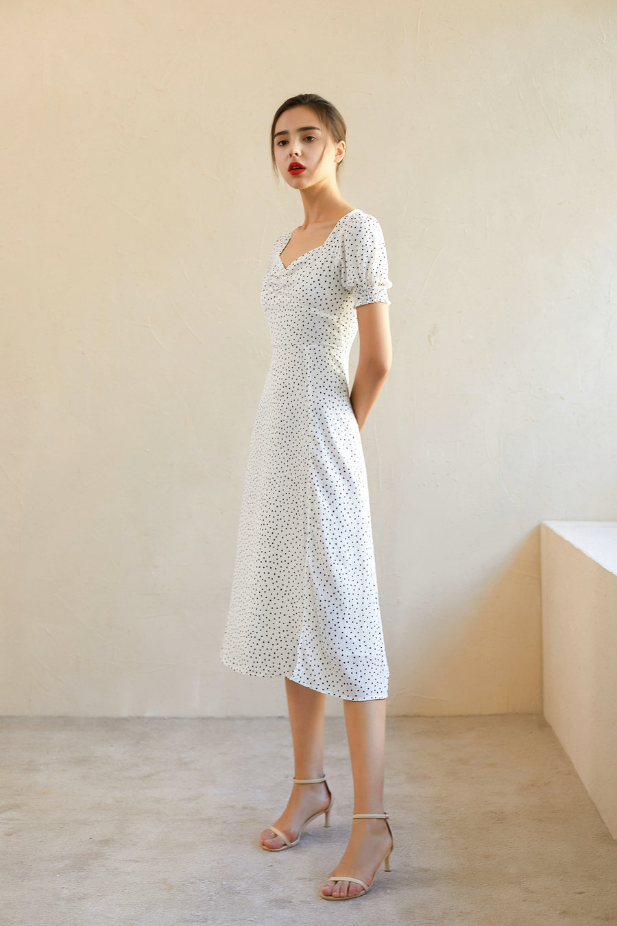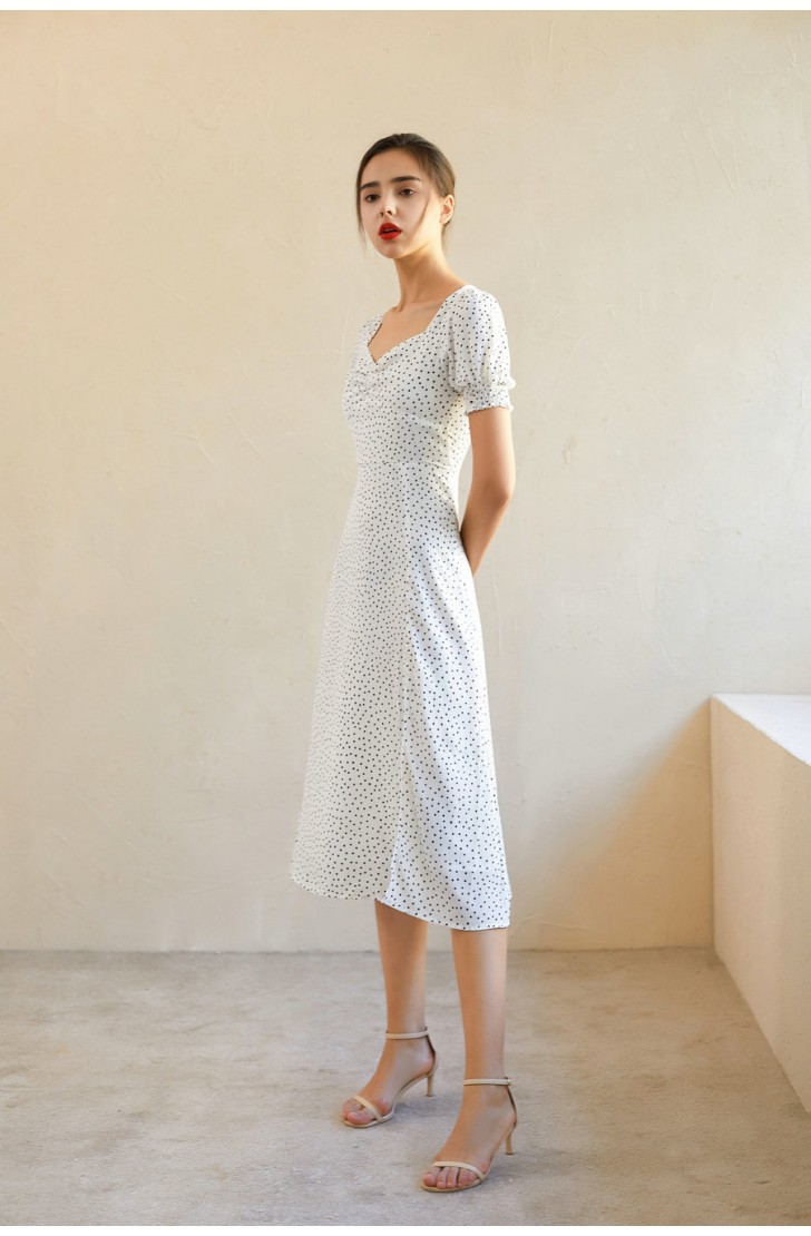 titivate品牌女装2020春夏新款白色波点收腰显瘦开衩连衣裙中长款