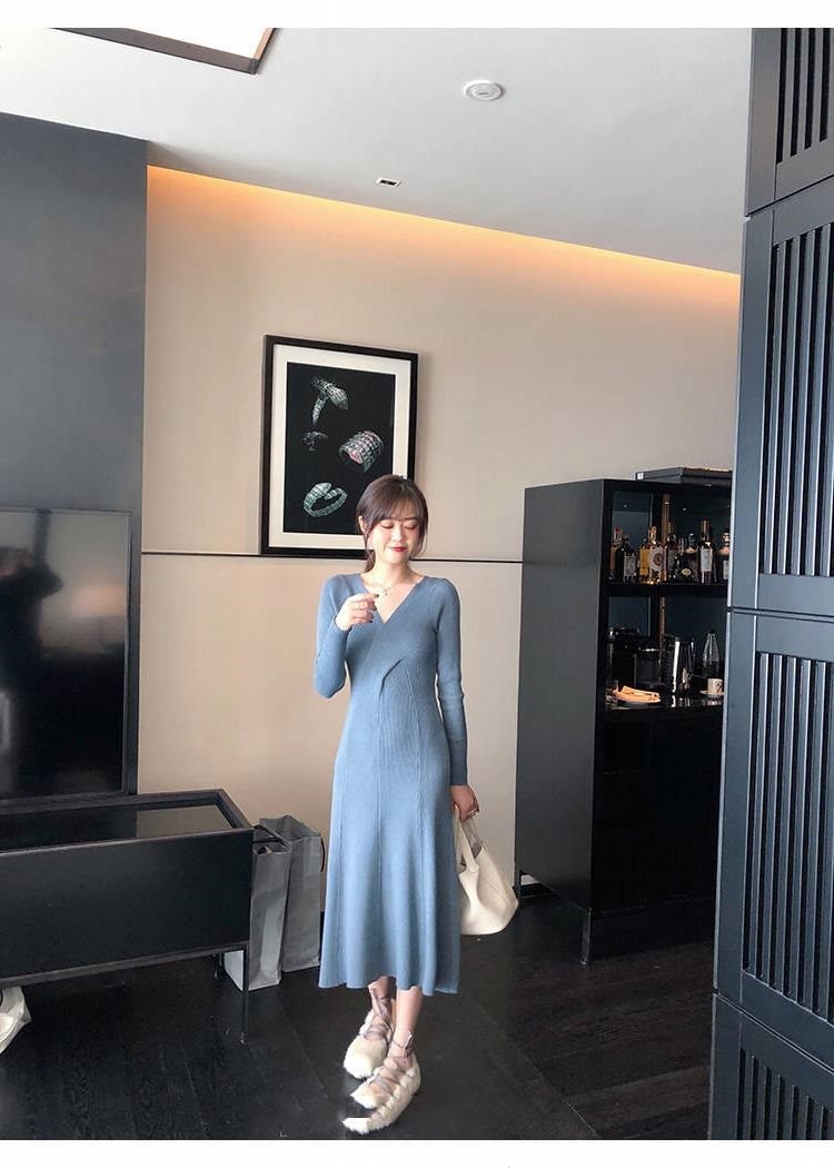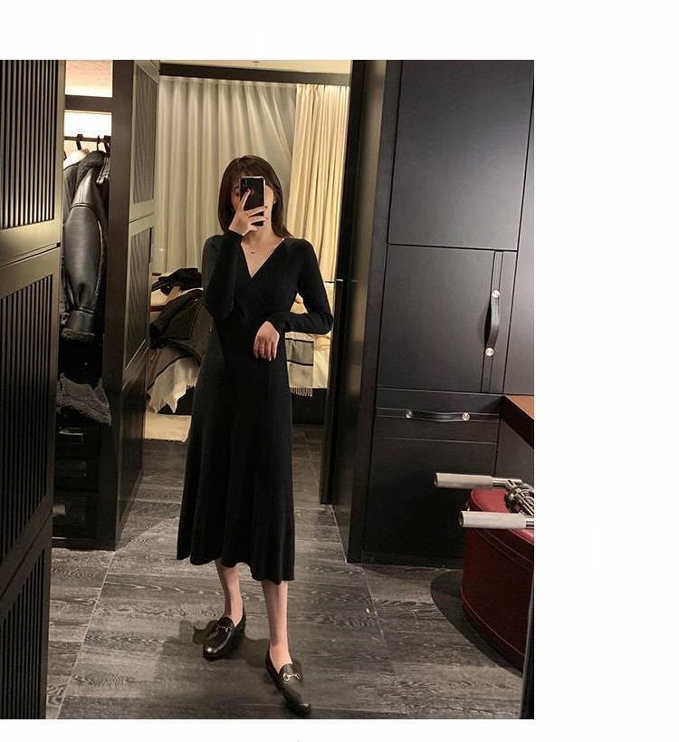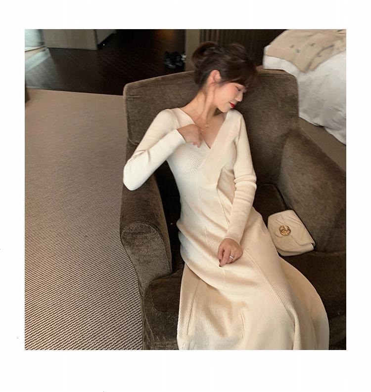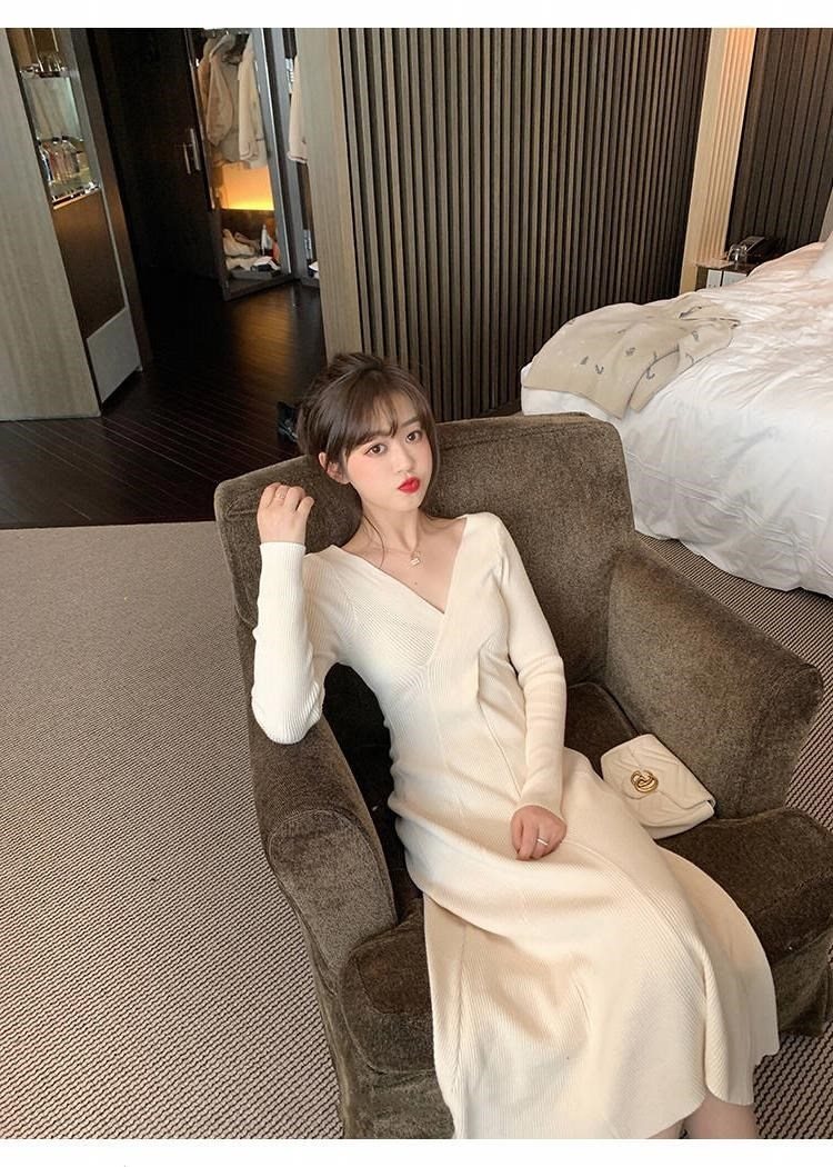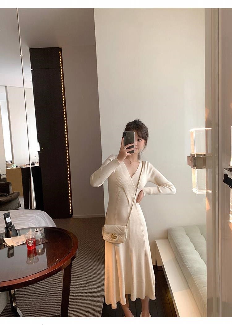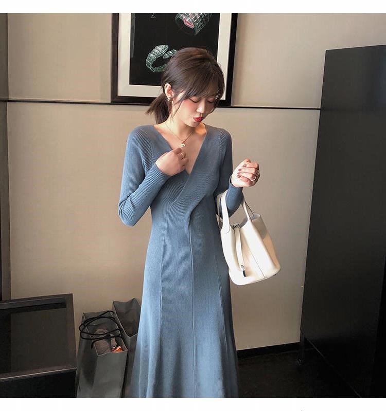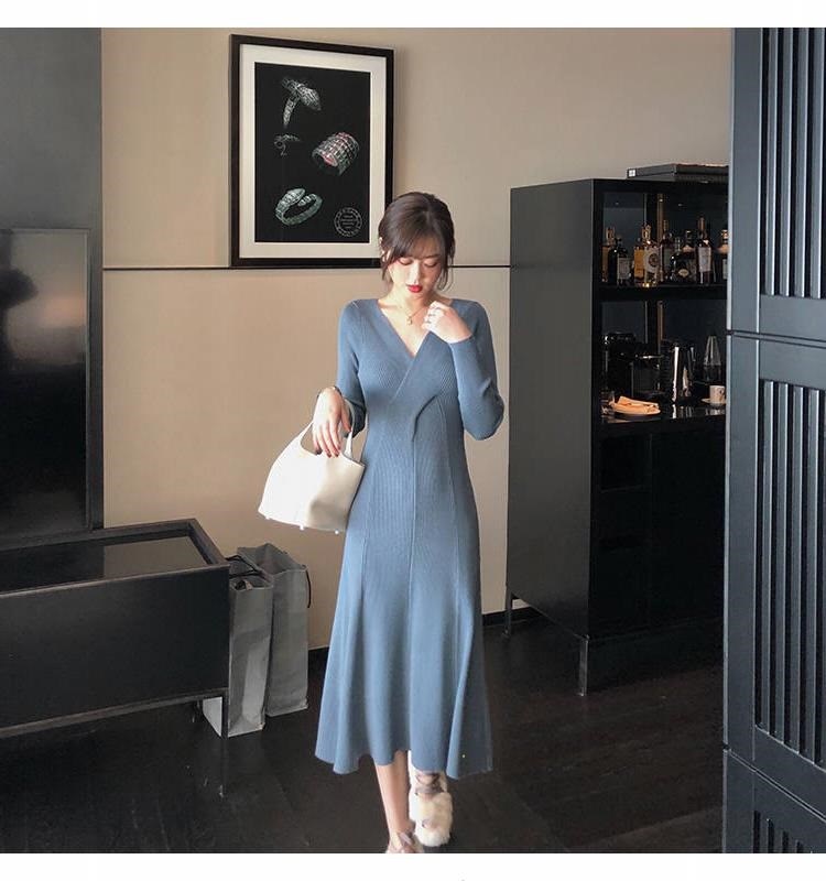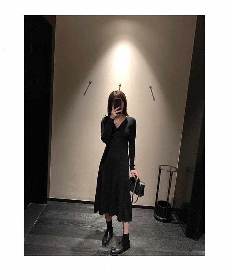 titivate针织连衣裙女新款修身中长款百搭显瘦V领高腰打底毛衣裙