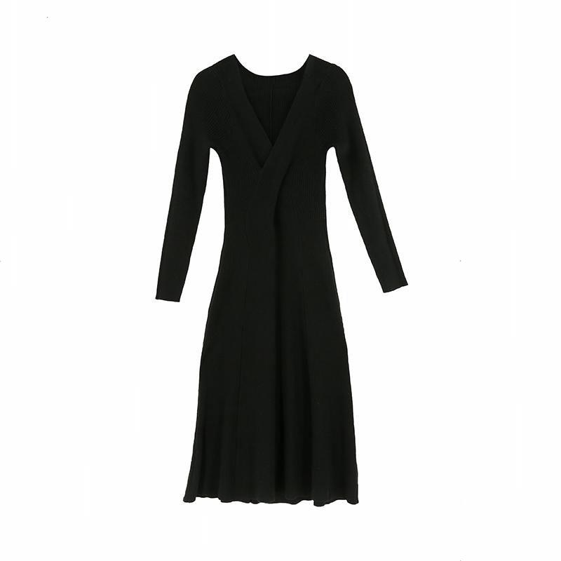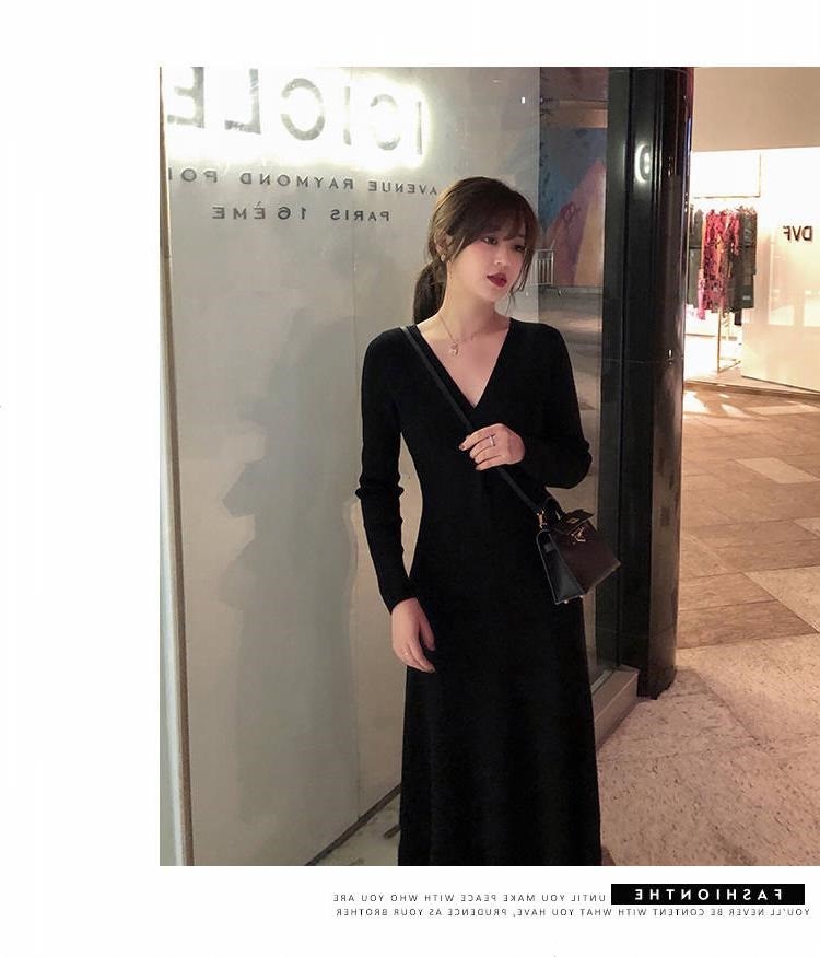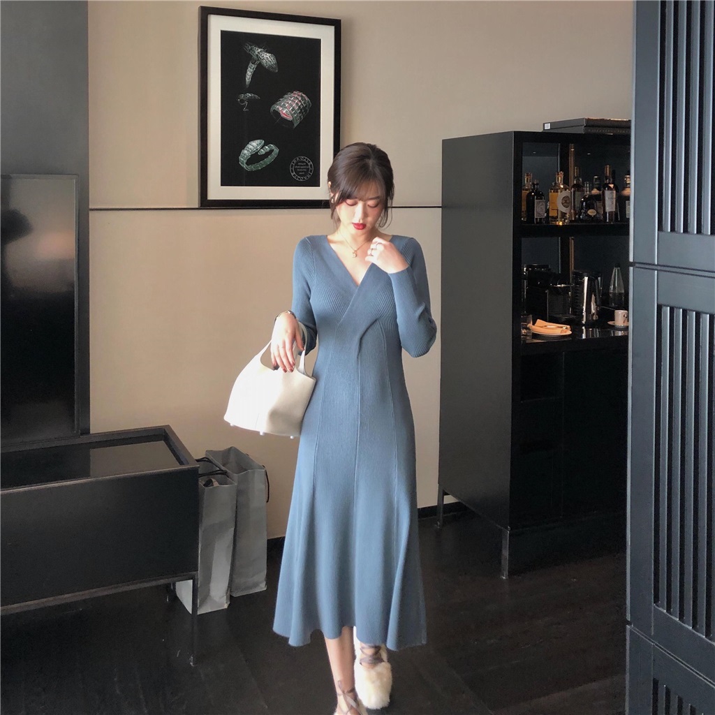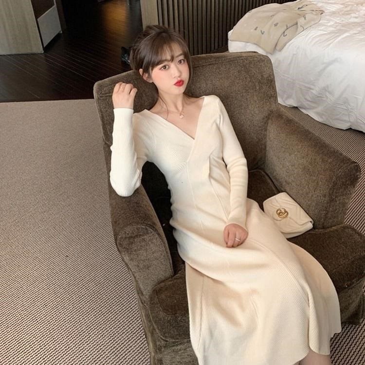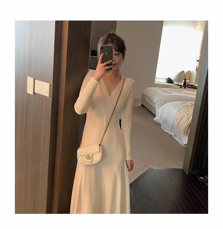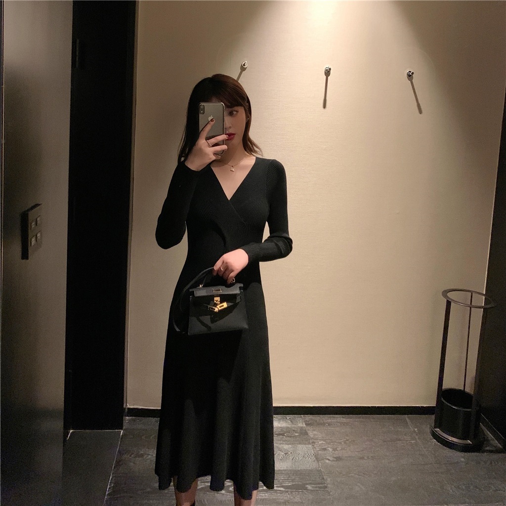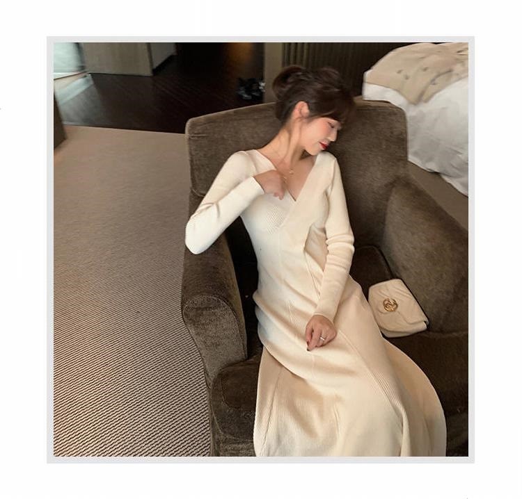 titivate针织连衣裙女新款修身中长款百搭显瘦V领高腰打底毛衣裙