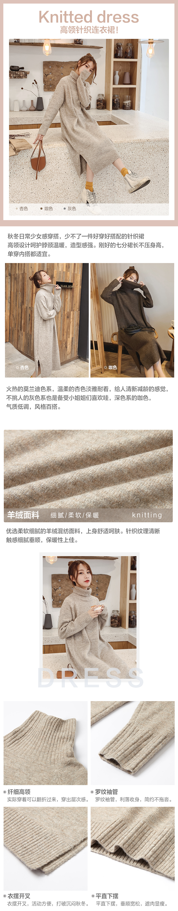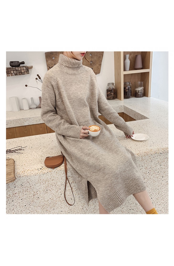 titivate针织连衣裙女秋冬新款内搭长款过膝打底裙开叉高领毛衣裙