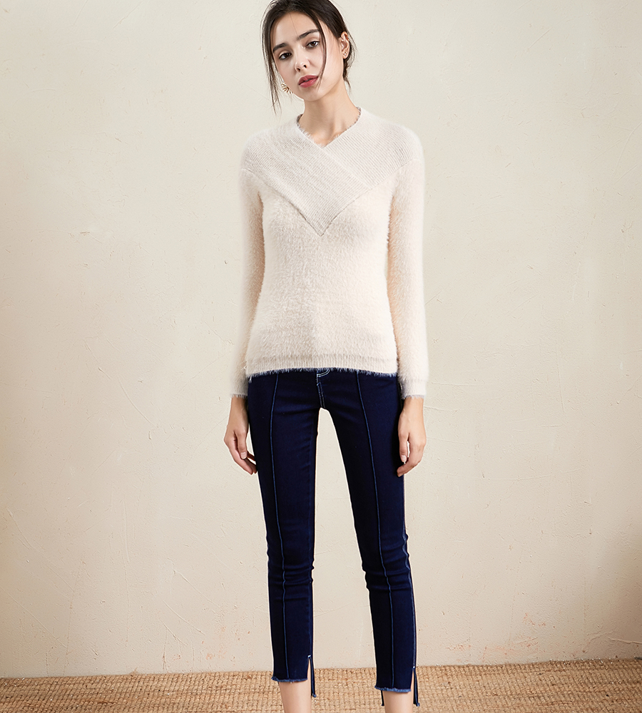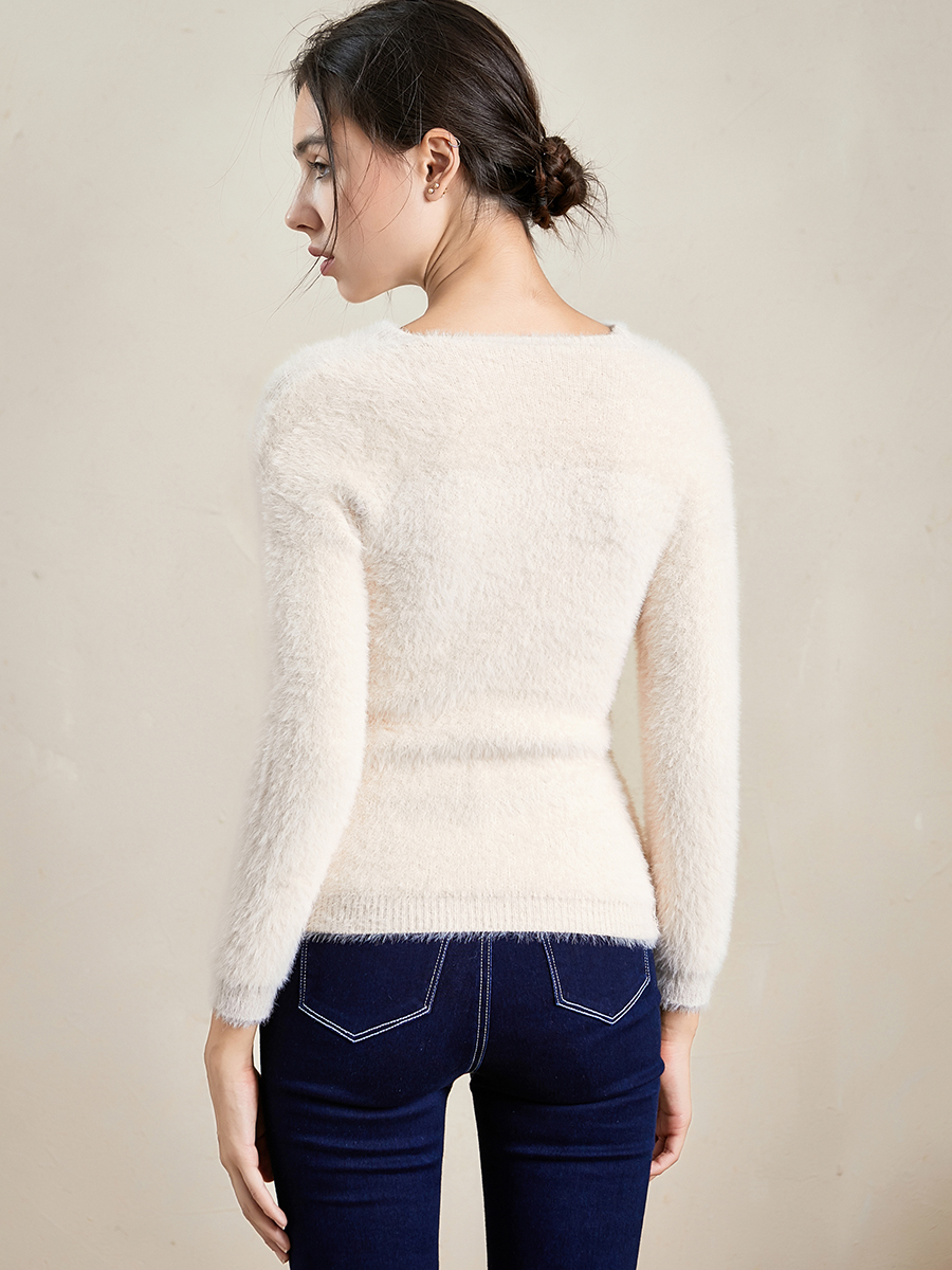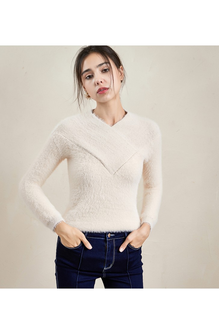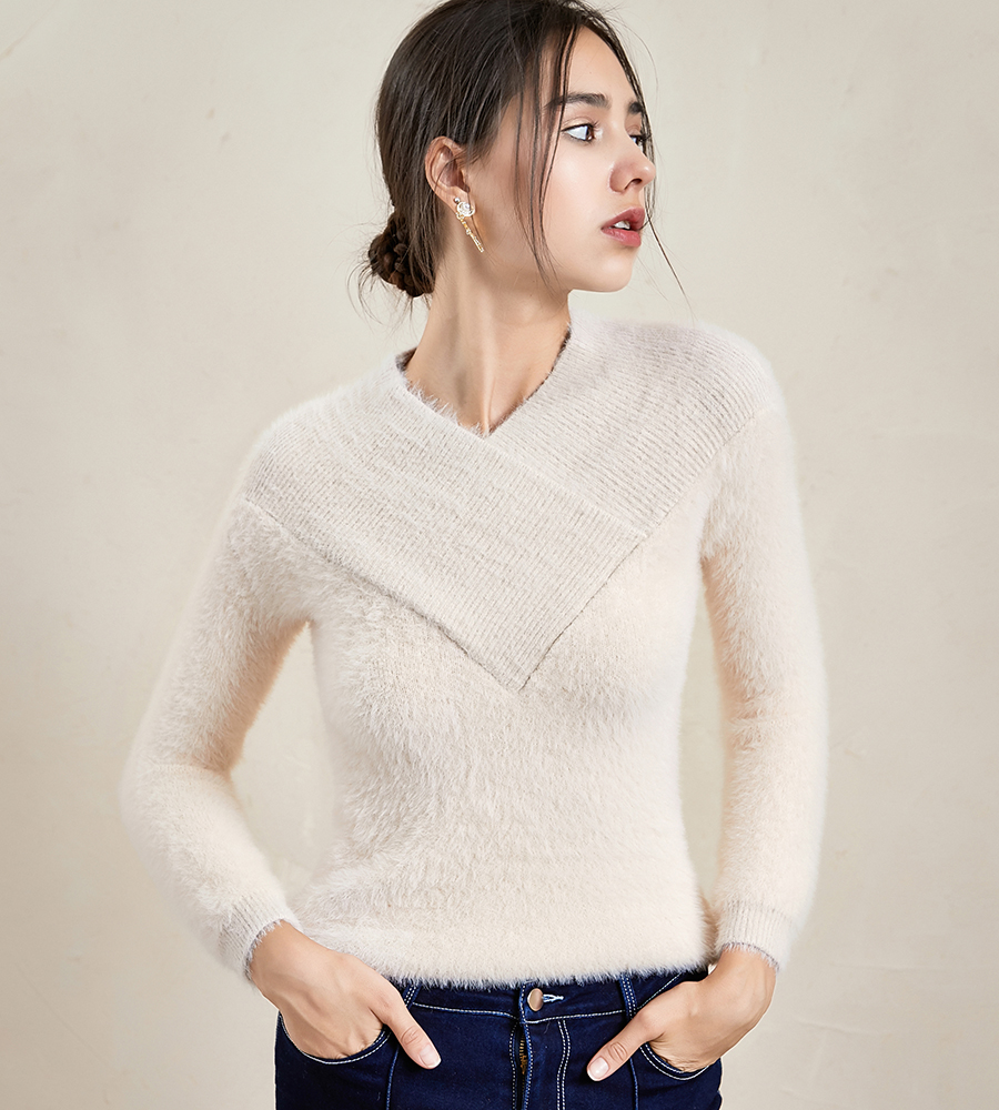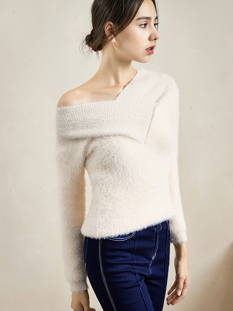 titivate毛绒毛衣2020新款性感大V领露肩毛衣女仿水貂绒百搭上衣