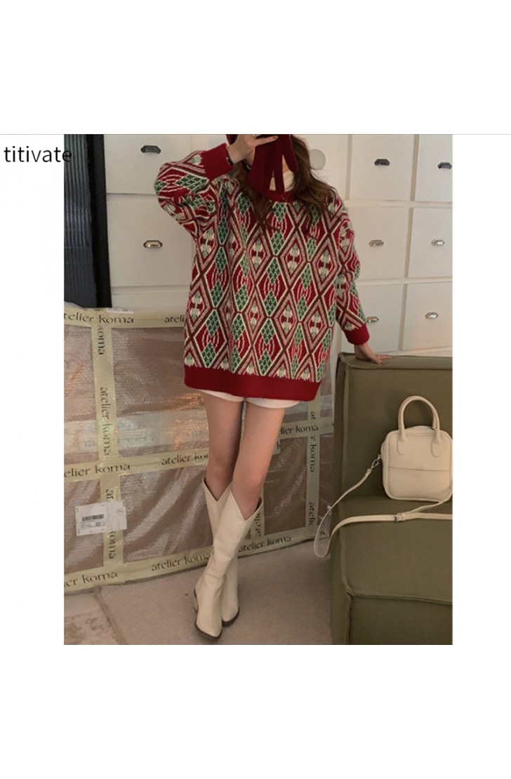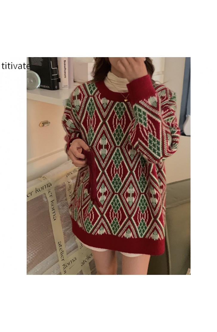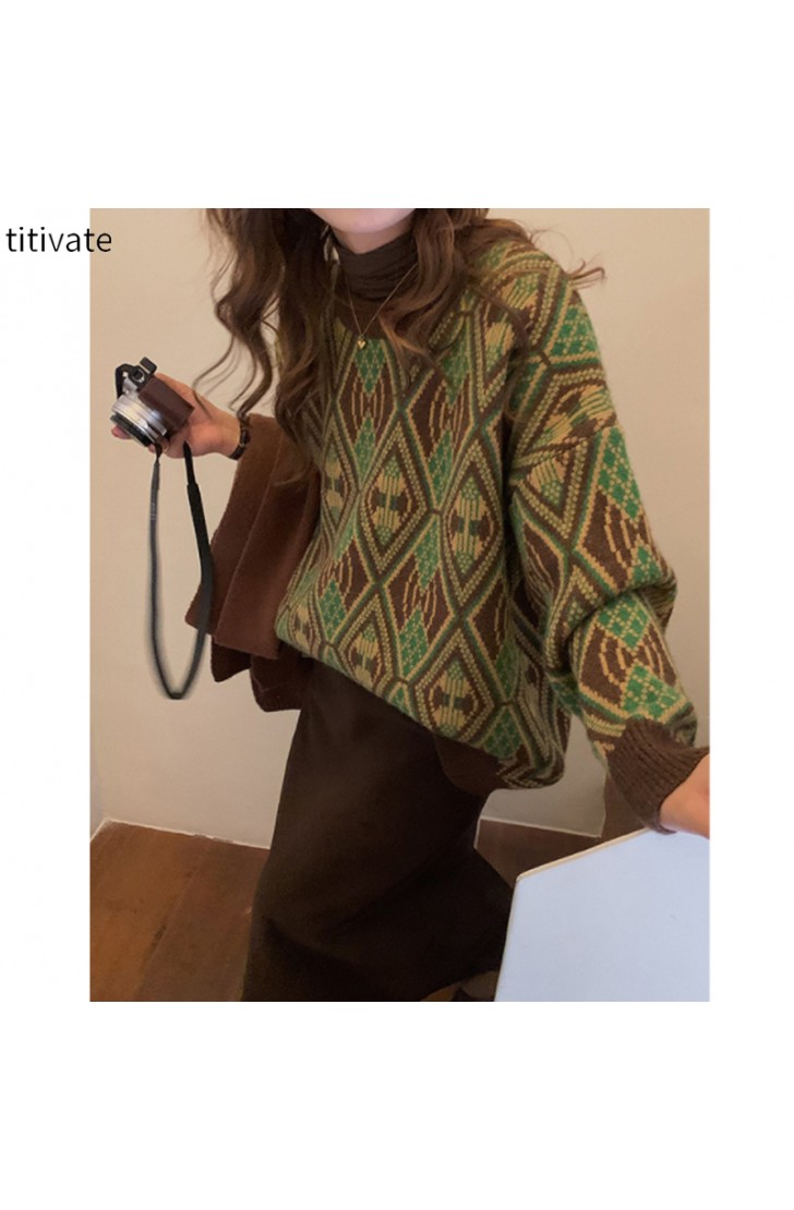 titivate冬季新款复古圆领套头提花毛衣女韩版宽松针织上衣