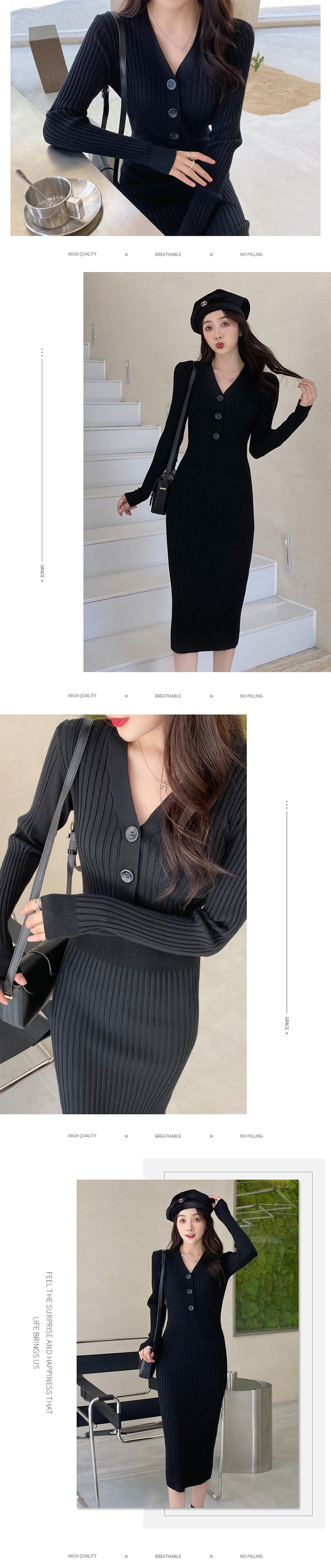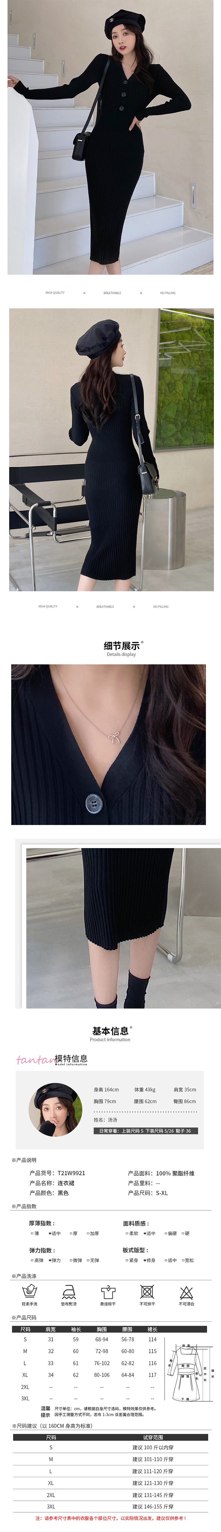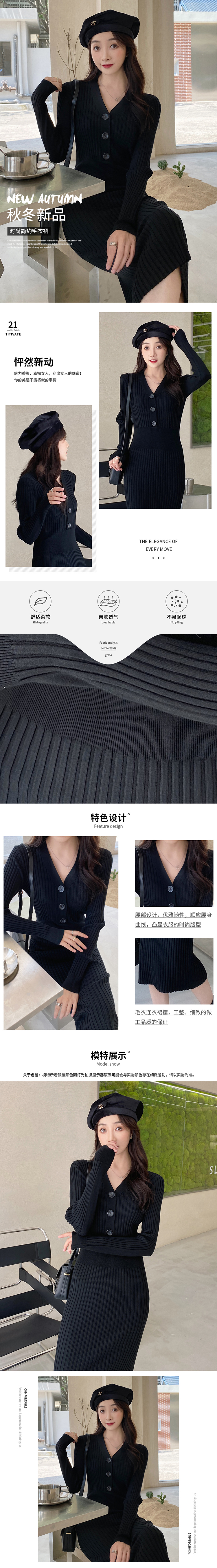 titivate新款秋季打底毛衣长裙法式v领收腰内搭黑色长袖针织连衣裙女