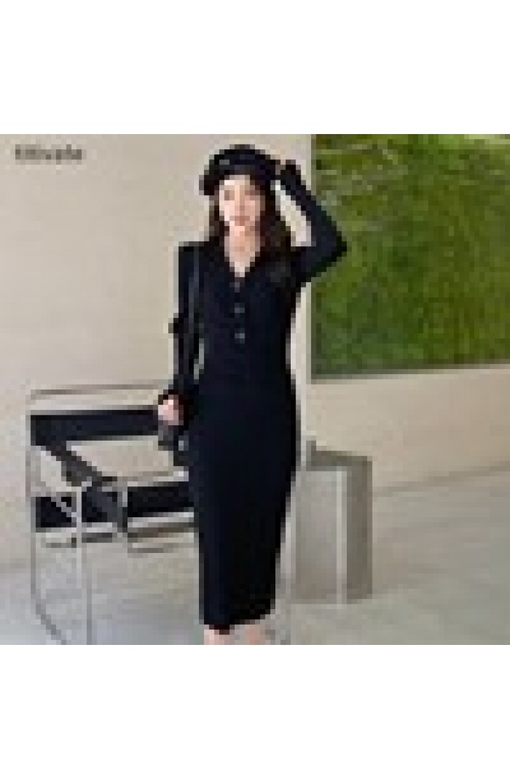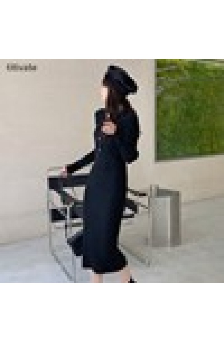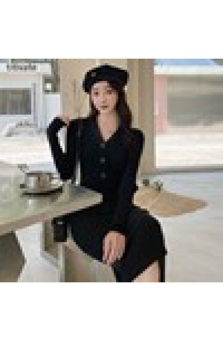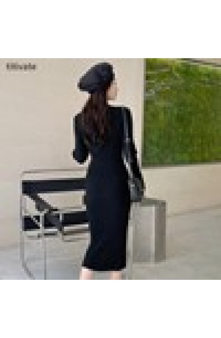 titivate新款秋季打底毛衣长裙法式v领收腰内搭黑色长袖针织连衣裙女